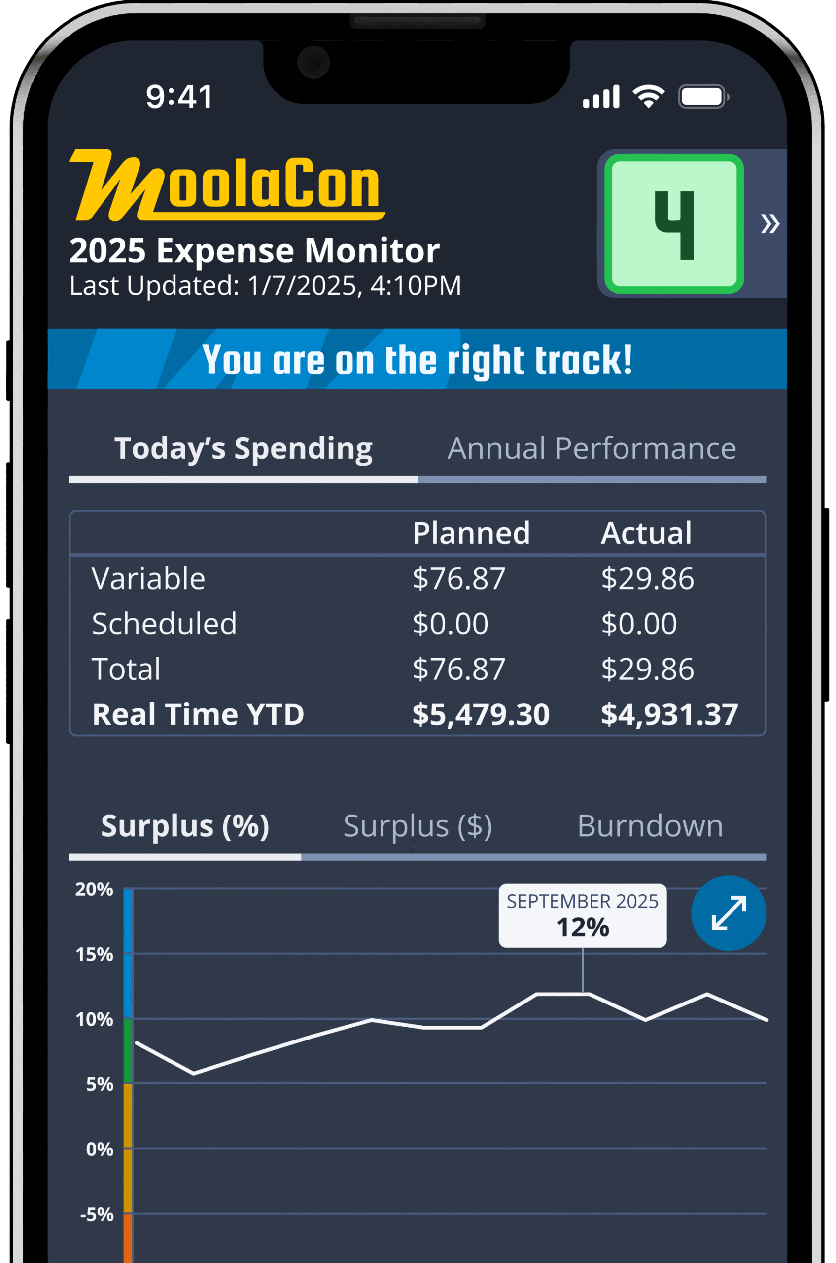MoolaCon continuously evaluates your budget and assigns one of five spending readiness levels—ranging from “ahead” to “on track” to “time to slow down” – giving you a clear, real-time view of how your daily spending impacts your financial goals.